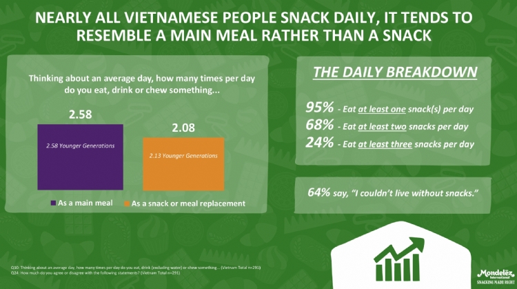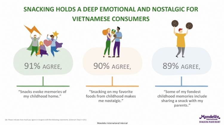 Survey results reveal that 95% of Vietnamese consumers snack at least once a day, and 98% say they can easily find products that suit them. Snacking is not only a habit but also an enjoyable experience: 84% feel excited when discovering new foods, while 83% see choosing snacks as an engaging activity.